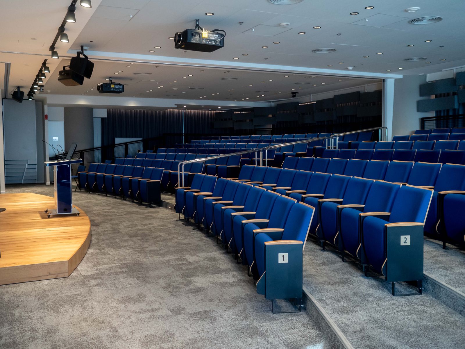 אודיטוריום עם 180 מקומות ישיבה מאובזרים בשקע חשמל USB ושולחן אישי.