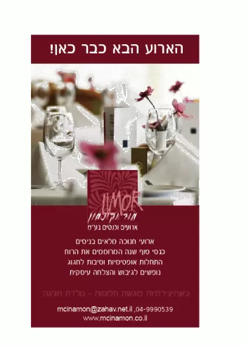 מור וקינמון – אירועים וכנסים בע"מ הפקת אירועים למגזר העסקי והפרטי עסקי : כנסים, נופשים, מסיבות, אירועי קייץ , ימי גיבוש וכד… פרטי : חתונה, בר מצווה, ועוד